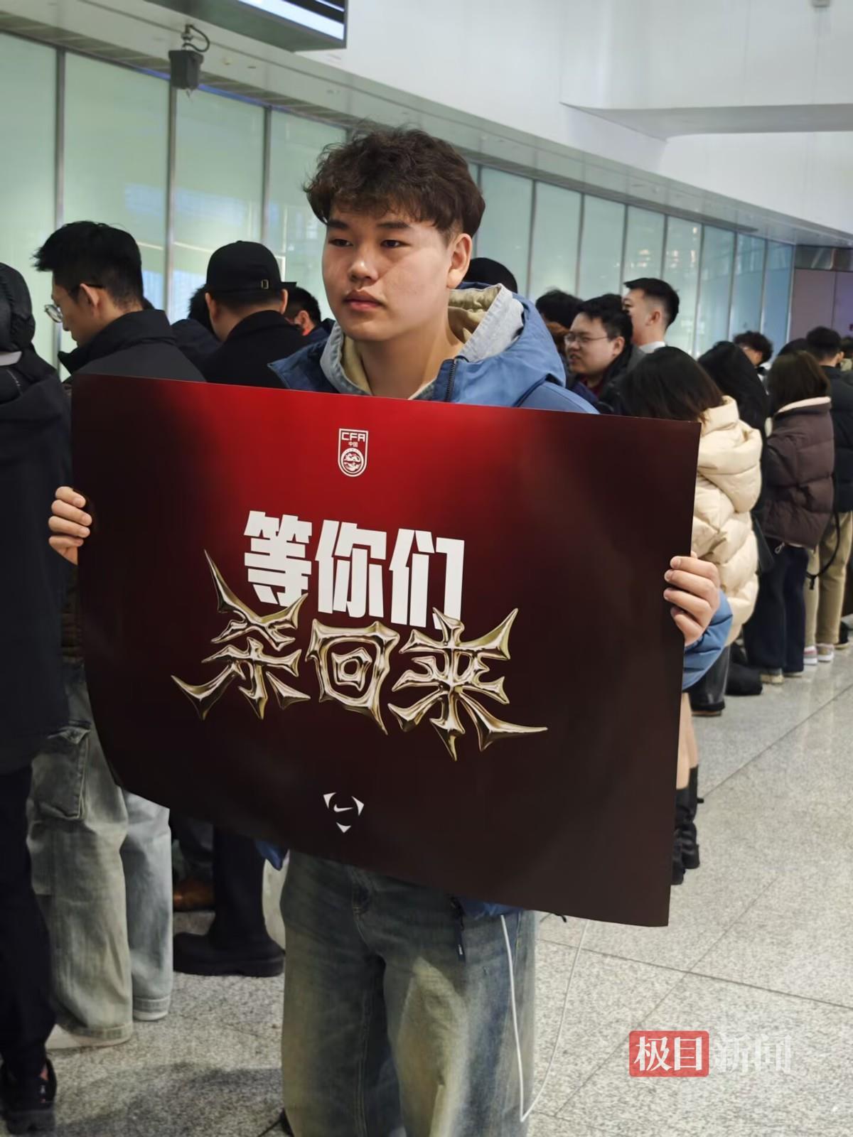 极目新闻记者在现场看到,还有球迷举着“等你们,杀回来”的应援海报等在到达口,也有球迷在现场喊着“国足加油”“中国加油”等应援口号。